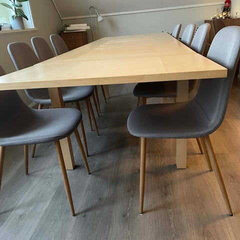 Gammelt spisebord med laminert topp (decifix) og malte bein. Har vert ein kjemisk reaksjon med no greier som har fjernet fargen på et lite område på lamineringen 😵 💫 Mål: 180×90 cm. (Uten stoler). Hentested vormedal. Fint bord men med et bruksmerker på bordplate.