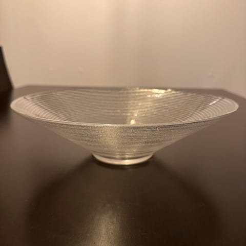 Gasskål i klart glass. Diameter 23 cm. Høyde 5,5 cm. Passer til servering eller dekorasjon. Merke ukjent.