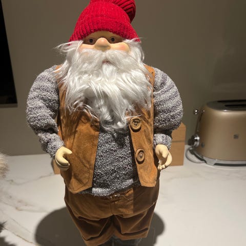 nissefigur med rød lue, rosa skjerf og klær. Figuren har hvitt skjegg og briller. 36 cm høy. Selges for 200.kr .Kjøper betaler porto.