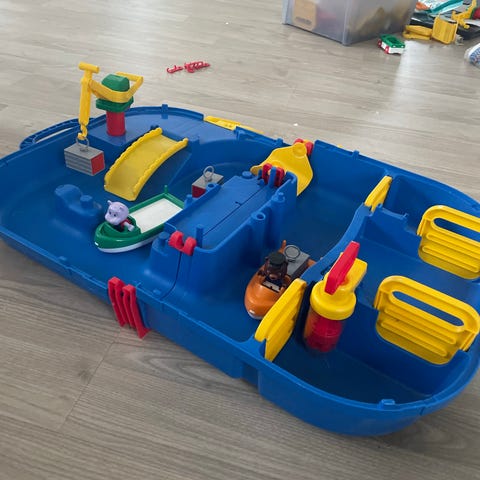 Aquaplay lekesystem vannbane i blå og grå plastmateriale. Lekesystemet består av flere sammenkoblede deler som danner en vannbane med tilbehør som båter og sluser. Passer for barn til lek med vann og utvikling av motoriske ferdigheter.