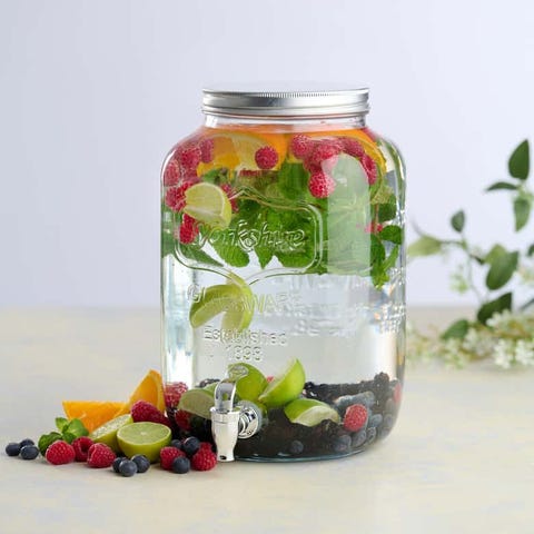 Mugge, saft, heller, juice, combucha, servering, frokost, vann med frukt, glas, glass.