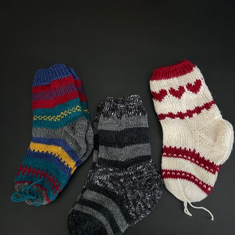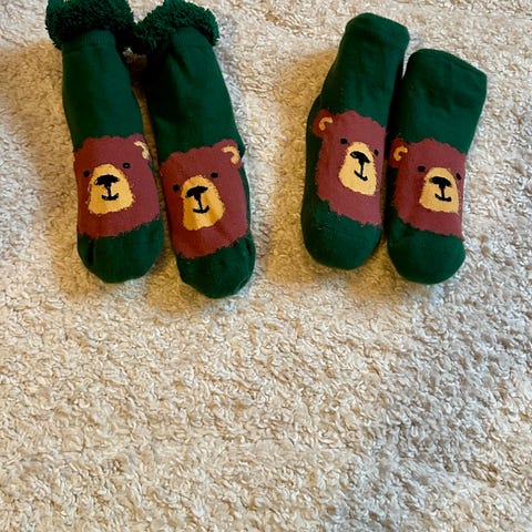 Sokker med julemotiv. Begge har antiskli under. Blå måler ca 12 cm i foten og de hvite ca 14cm. De hvite er foret. Selges for 15kr pr par eller 25kr samlet. Hentes Konnerud eller sendes
