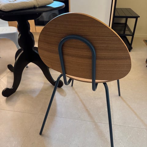 Base spisestol med hvitt plastsete og bein i tre.