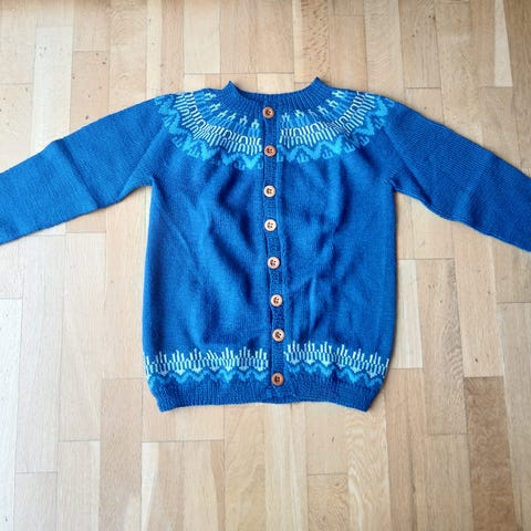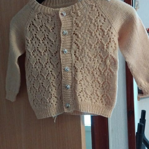 Jakke og bukse strikket i Baby merinoull. Jakke og bukse har vært brukt både ute og inne på sen høst/ vinter. Nupper forekommer på bukse, disse kan fjernes med litt jobb. Ikke sett noen på jakken. Veldig god og varm, har vært i bruk fra ca 6mmd alder til 1.5 år i barnehagen.