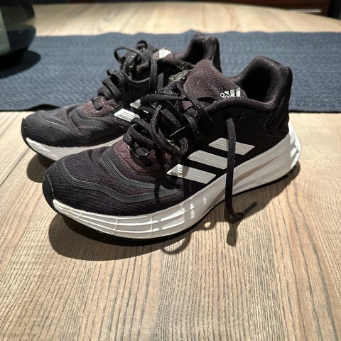 Adidas unisex sko i størrelse 36, farge blå. Skoene har synlige bruksspor og noe slitasje på materialet rundt åpningen. Sålen er laget for godt grep. Egnet for daglig bruk. Kjekt å ha som ekstra sko til tur/lek