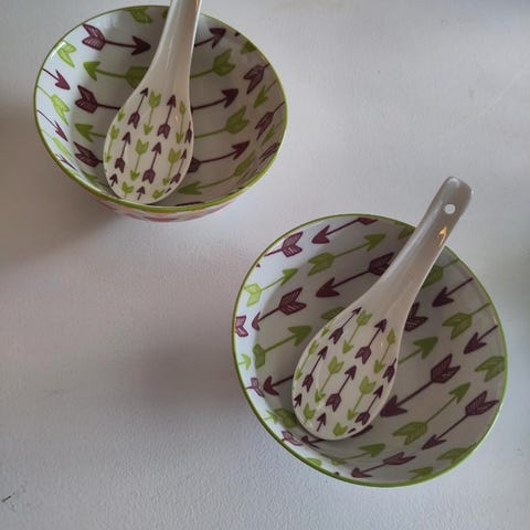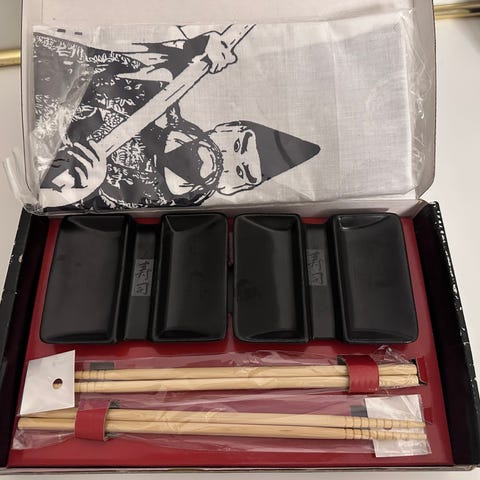 Includes; ceramic ramen bowl, tea mug, sticks, stickholder, wooden ramen spoon and serving plastic to put under