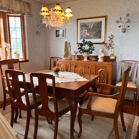 Eik spisebord med to ileggs plater og 8 stoler til salgs