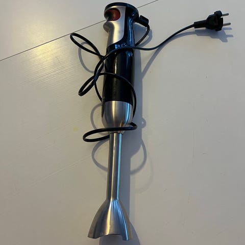 Philips stavmikser i hvit farge. Produktet har et ergonomisk design med en avrundet form og en ledning for tilkobling til strøm.