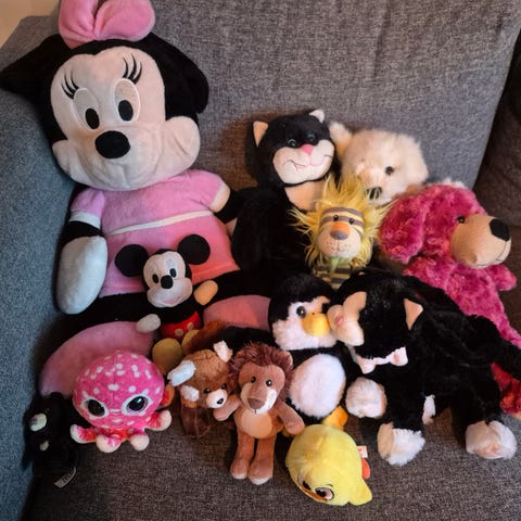 Samling av myke kosedyr i ulike dyreformer. Varierte farger og størrelser, laget av tekstilmaterialer. Passer som leketøy eller dekorasjon.
