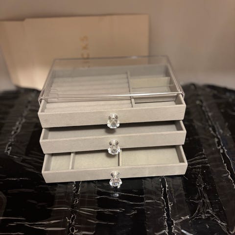 Nypris ca 1200kr, selger billig da det er en del bruktmerker. Bruksmerkene er at ytterste lag flasser litt av noen plassen (se de siste bildene), men ellers veldig solid og flott smykkeskrin. Følger med et reise-skrin inni også, se bilder.