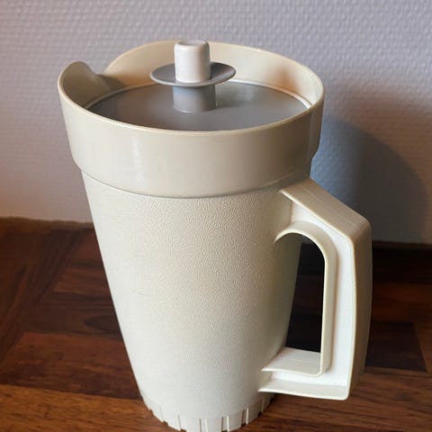 Retro Tupperware-kanne med trykklokk.