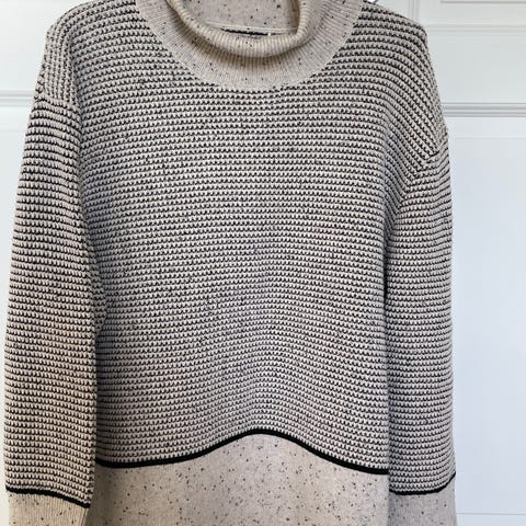 Pent og lite brukt genser med litt A-form. Har klipt bort vaskelappen, men tror det er blandingsprodukt (ull og viskose).