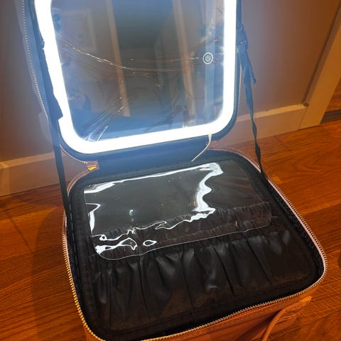 Sminkeveske med speil og innebygd, oppladbar LED-belysning.