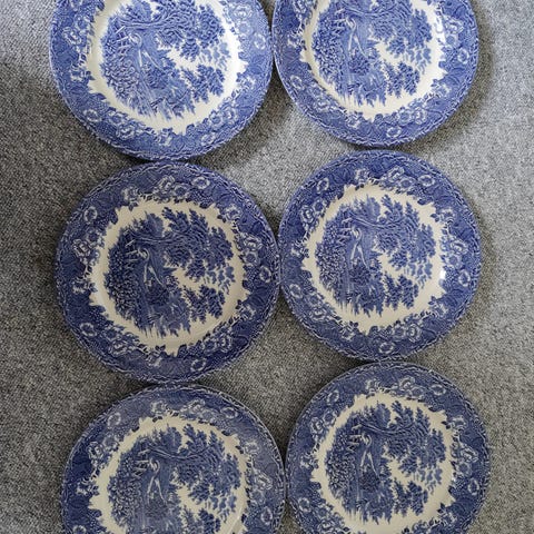 Selger et sett med 6 tallerkener fra 222 Fifth / PTS International, serie Papyrus. Steintøy (stoneware) i varm kremfarge med blått plantedekor i midten og dekorativ, bevisst “slitt” kant.
