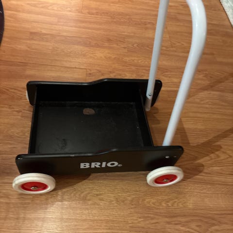 BRIO barnevogn i tre med hvitt håndtak og røde hjul. Barnevognen er svart med synlige bruksmerker.