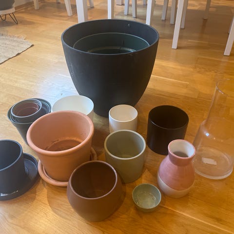 Assorterte blomsterpotter og potte skjulere i ulike størrelser og farger, inkludert hvit, svart, rosa og grå, sølv. Pottene har forskjellige teksturer og mønstre, og noen har dreneringshull. Egnet for innendørs bruk til planter og blomster. Har også en del selvvanninngs potter fra Lechuza. Selges til god pris helt ned i 5kr per stk og oppover, eller vi finner en god pakkepris for alt.