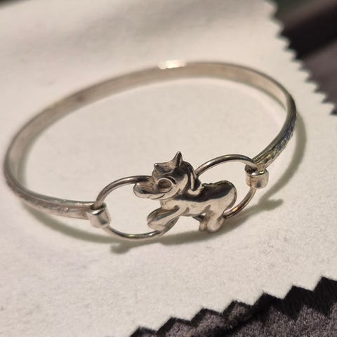 Selger et flott vintage sølvarmbånd med motiv av hoppe og føll. Armbåndet er håndlaget og produsert på 70-tallet i Mexico. Smykket er i utmerket stand for sin alder uten skader eller nag.