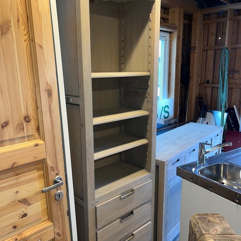 Ene hylla er feillaminert, dvs at endeveden synes på fremsiden av ene hylla. Har ikke brydd oss om å reklamere på det da det ikke har hatt noe for bruken sin del å gjøre. Selges for 900 kr eller fornuftig bud.