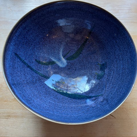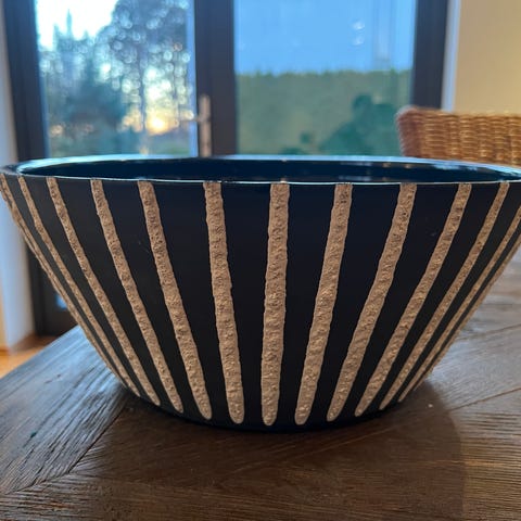 Antikk eldre keramikkbolle med brun utside og glasert innside. Bollen har en enkel, rund form med diameter 27 cm. Egnet for bruk i kjøkken eller til dekor. Antagelig fra sent 1800 - tidlig 1900 tall. Fin og hel og svært sjarmerende. Bollen må hentes på Lilleaker.