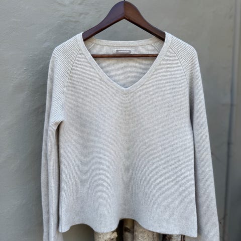 Passform: Romslig og moderne fasong med v-hals og ribbestrikkede kanter. Splitt i sidene som gir et fint fall.