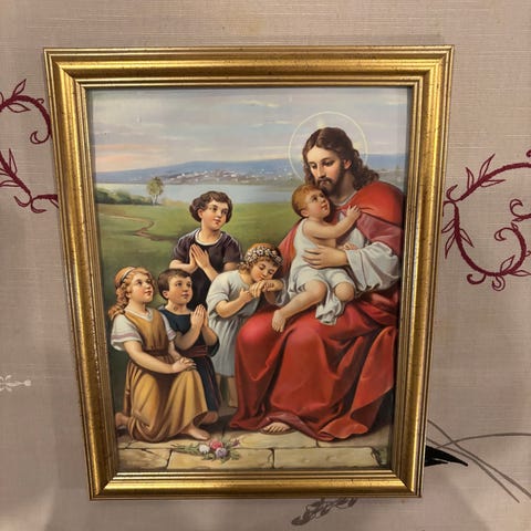 Nydelig innrammet Kristus-motiv i pen hvit ramme. Avlangt, spør gjerne om mål da jeg ikke vet dette for øyeblikket. Må hentes.