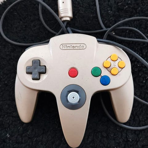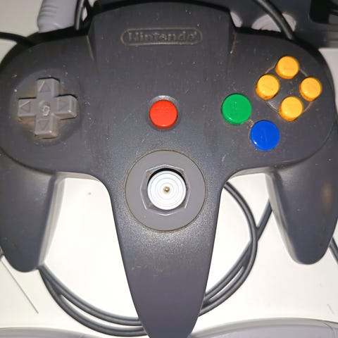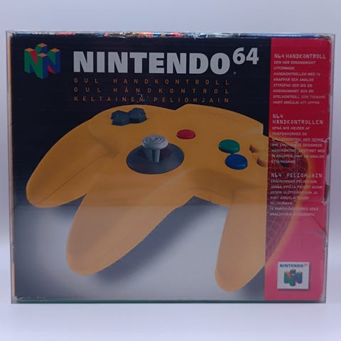 Nintendo 64 spillkontroller i svart farge. Designet for bruk med Nintendo 64-konsollen. Har standard knapper og kontrollpinne for spillkontroll. Styrespakene er helt intakt