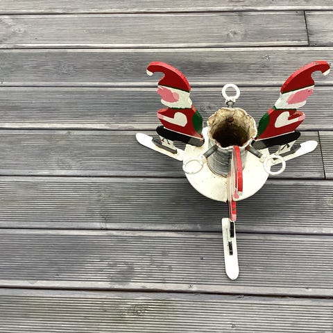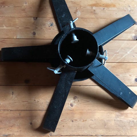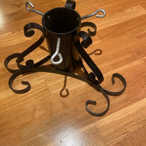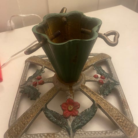 Pen og dekorativ juletrefot i støpehjern, trolig fra 50-tallet.