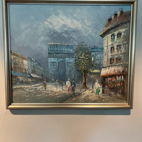 Selger et stemningsfullt oljemaleri signert Burnett. Klassisk europeisk/ parisisk bygatemotiv malt i impresjonistisk stil med tydelig struktur og liv i penselstrøkene.