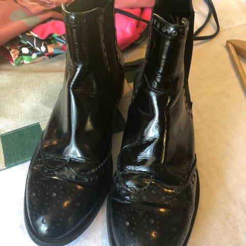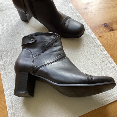EDIT sorte skoletter med hæl i størrelse 41. Tilsvarer strl.39-40. Skoene har en glatt overflate og middels høy hæl.