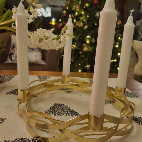Stelton tangle engel i gullfarget metall og 2 tilhørende små lysestaker. To ubrukte lys medfølger. Pris engel: 390kr