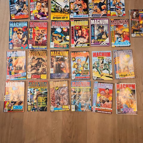 Samling av tegneserier inkludert Magnum, Conan, X9, Vietnam, Humorparaden og flere titler. Inneholder ulike utgaver med varierende temaer og historier. Selges samlet. Ta kontakt hvis det bare er ønske om deler av bladene.