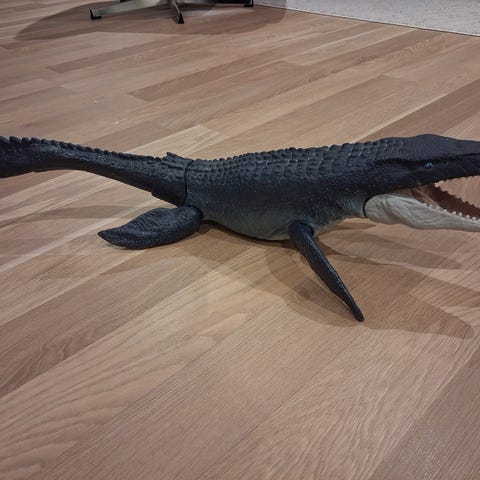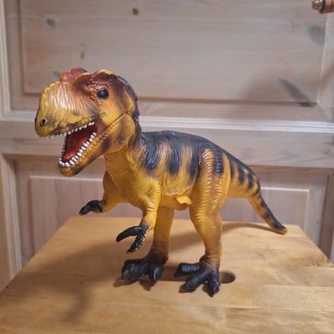 Sett med flere dinosaurleker i ulike størrelser og farger. Inkluderer en stor grønn krokodille-aktig dinosaur, en gul og svart stripete T-Rex, og flere mindre dinosaurfigurer i forskjellige farger. Passer som samleobjekter eller til lek.