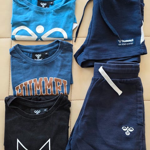 2 sett fra Hummel i str 104 selges samlet. Det lysegrå settet er i veldig god stand, uten hull eller flekker. Det grønne er litt mer preget av bruk/vask. Merket begynt å løsne bittelitt i kantene, spesielt på buksen, men heller ikke dette settet har hull eller flekker.