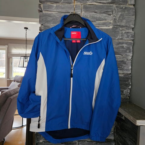 Pent brukt Swix treningsjakke i størrelse Junior 14–16 år. Jakken er lett, komfortabel og perfekt til trening eller fritidsbruk, spesielt egnet for ski eller løping. Fargekombinasjon av marineblå, hvit og røde detaljer gir et sporty utseende.
