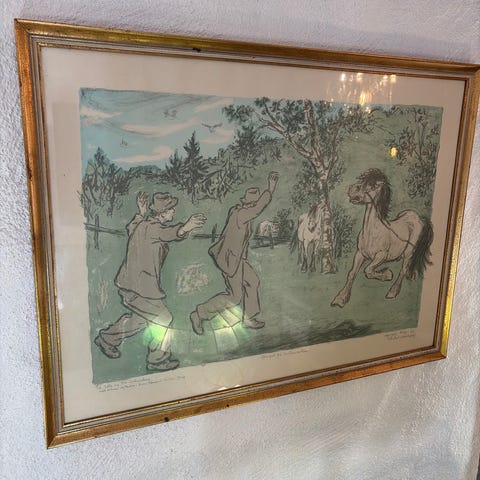 Harald Kihle litografi med motiv av Apensgården i Horten datert 1982.