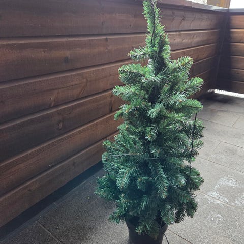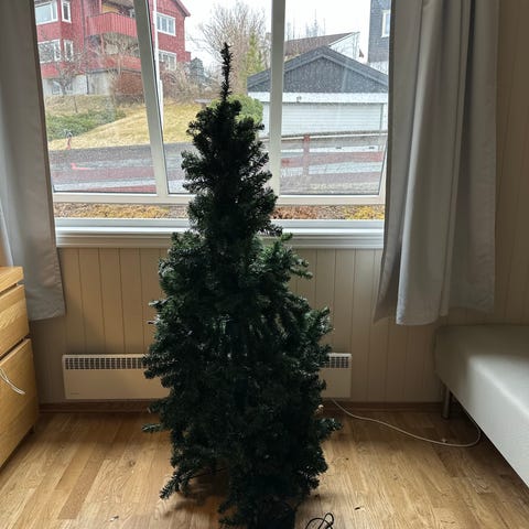 Juletre i plast gis bort. Dog med en fot som er vingeskeiv.