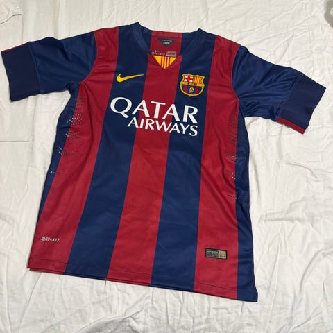 Barcelona fotballdrakt med Neymar Jr nummer 11. Drakten har la liga emblem, og den har røde og blå vertikale striper, laget i pustende materiale med perforerte detaljer på ermene for bedre ventilasjon. Den har klubbens emblem på brystet og sponsormerker på ermene. Kjøpt på DHgate