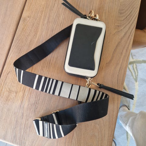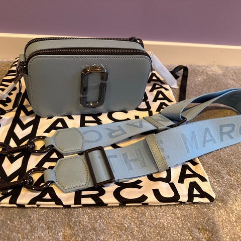 Marc Jacobs Snapshot skulderveske i lær for dame. Vesken har en kompakt størrelse med en justerbar skulderrem i flerfarget stoff og gullfarget metallkjede. Den har to glidelåslommer og et karakteristisk dobbel-J-logo på forsiden.