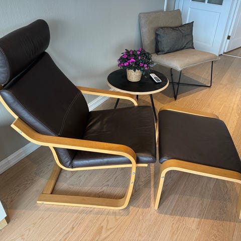 Brukt POÄNG Lenestol, hvitbeiset eikefiner med skinntrekk og fotskammel