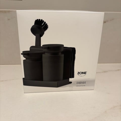 Selger et oppvasksett i svart, her har du til både vanlig såpe og f.eks zalo, oppvaskbørste og sort klut følger med, (klut er kun brukt 3 ganger).