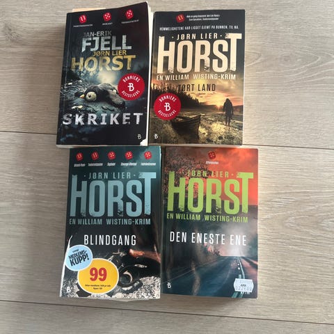 Jørn Lier Horst «Nattmannen», «Forræderen» selges samlet kr.90. Pocketutgaver. «Tørt land» er solgt. Lest og bladd i av tre stk.