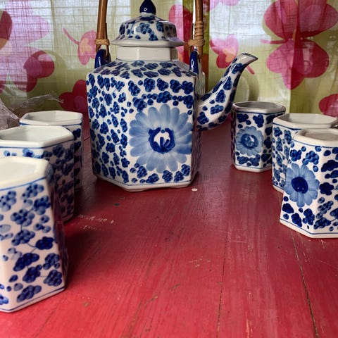 Dette service, laget i Kina, har stått i skapet i flere år. Ubrukt. Det er litt utenom det vanlige, tekoppene har ikke hank, begge hender bør brukes. Det er til seks personer.