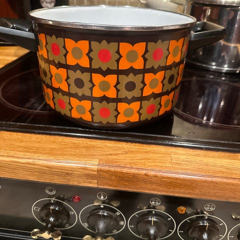Arabia gryte med lokk i svart farge med hvite bladmotiv. Mer egnet til pynt enn til matlaging, bærer preg av at den er mye brukt. Selve kasserollen har en diameter på 22 cm.