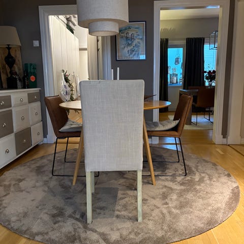 8 stk stoler med grått stofftrekk og metallben. Stolene har polstret sete og rygg med et mønstret design. Passer til bruk i stue eller andre oppholdsrom. Kan hentes i Askim