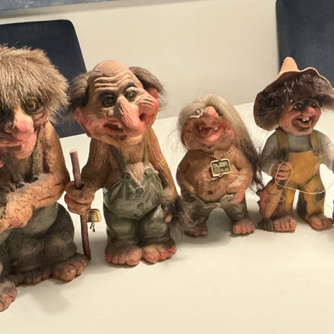 Vintage håndmalte trollfigurer i hardplast fra Erling Krage. Nummerert 63/801 og 63/602.