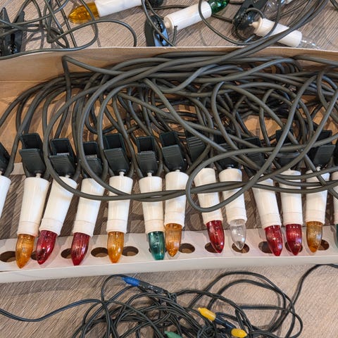 10 lys der 9 virker helt fin.. Esken er stort sett hel og fin , men har en rift i det ene hjørnet.