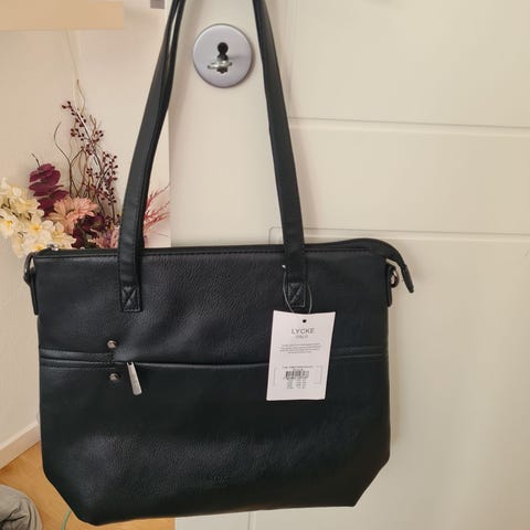 Dame veske laget av svart kunstlær. Vesken har en unik design som etterligner en jakke med glidelåser og knapper. Den har en størrelse på 21 cm x 9 cm x 16 cm, og inkluderer en justerbar skulderrem for bæring over skulderen. Egnet for daglig bruk og passer til ulike anledninger.