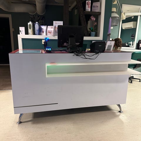 Resepsjonsdisk med buet design, glassplate på toppen og metallramme med perforert mønster. Egnet for kontor- eller resepsjonsbruk. Farge: hvit og sølvfarget. Materialer: glass og metall.