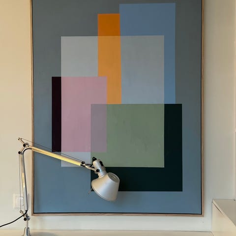 Bildet har et abstrakt uttrykk med myke former og god balanse. Leveres ferdig innrammet og klart til oppheng.