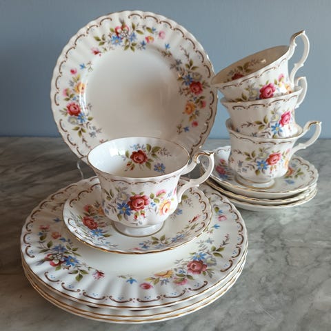 Utrolig vakre og delikate kaffekopper og asjetter selges. Alt er i perfekt stand. Har 6 sett; selges 200/sett- kaffekopp+skål+asjett, eller 1000kr +frakt for alle 6 sett. Kan pakke veldig godt og sende enten med fiks ferdig eller Postnord (69kr).